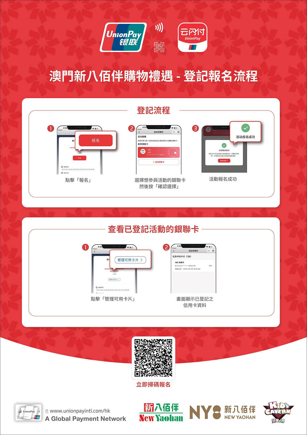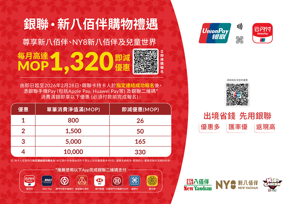 From now until February 28, 2026, UnionPay cardholders can enjoy up to MOP 1,320 off every month at New Yaohan(Nam Van Store) 、NY8 New Yaohan(Grand Lisboa Palace Store) and Kid’s Cavern(NOVA Mall) by successfully registering via the designated link and making purchases with UnionPay Mobile Pay and UnionPay QR Code.