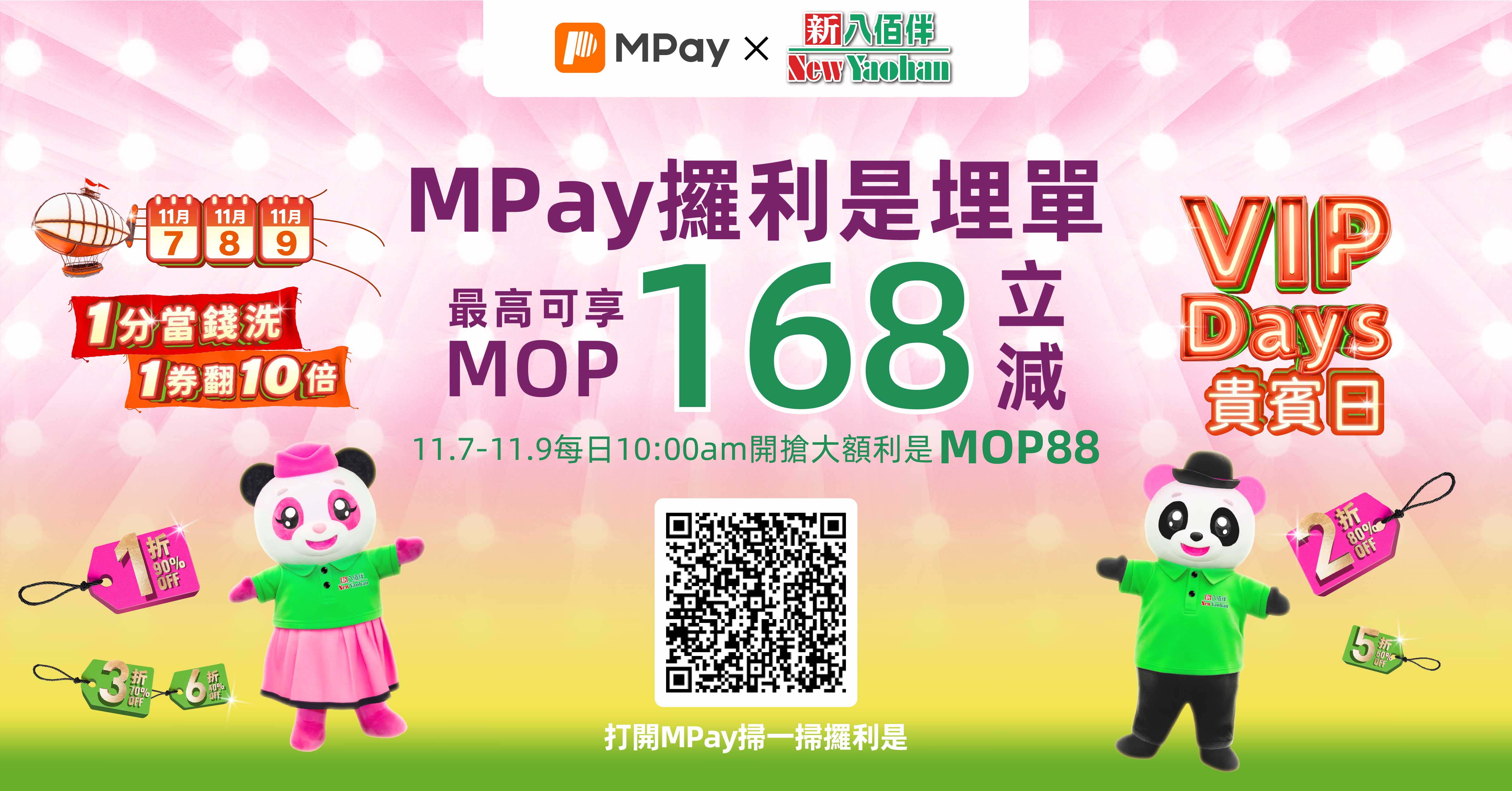 From 30th October to 9thNovember, 2025, eligible MPay users can access the VIP DAYS privileges by visiting the MPay homepage and clicking on the New Yaohan Promotion banner or by scanning the QR codes on offline materials to enter the dedicated New Yaohan event page and enjoy the following:
