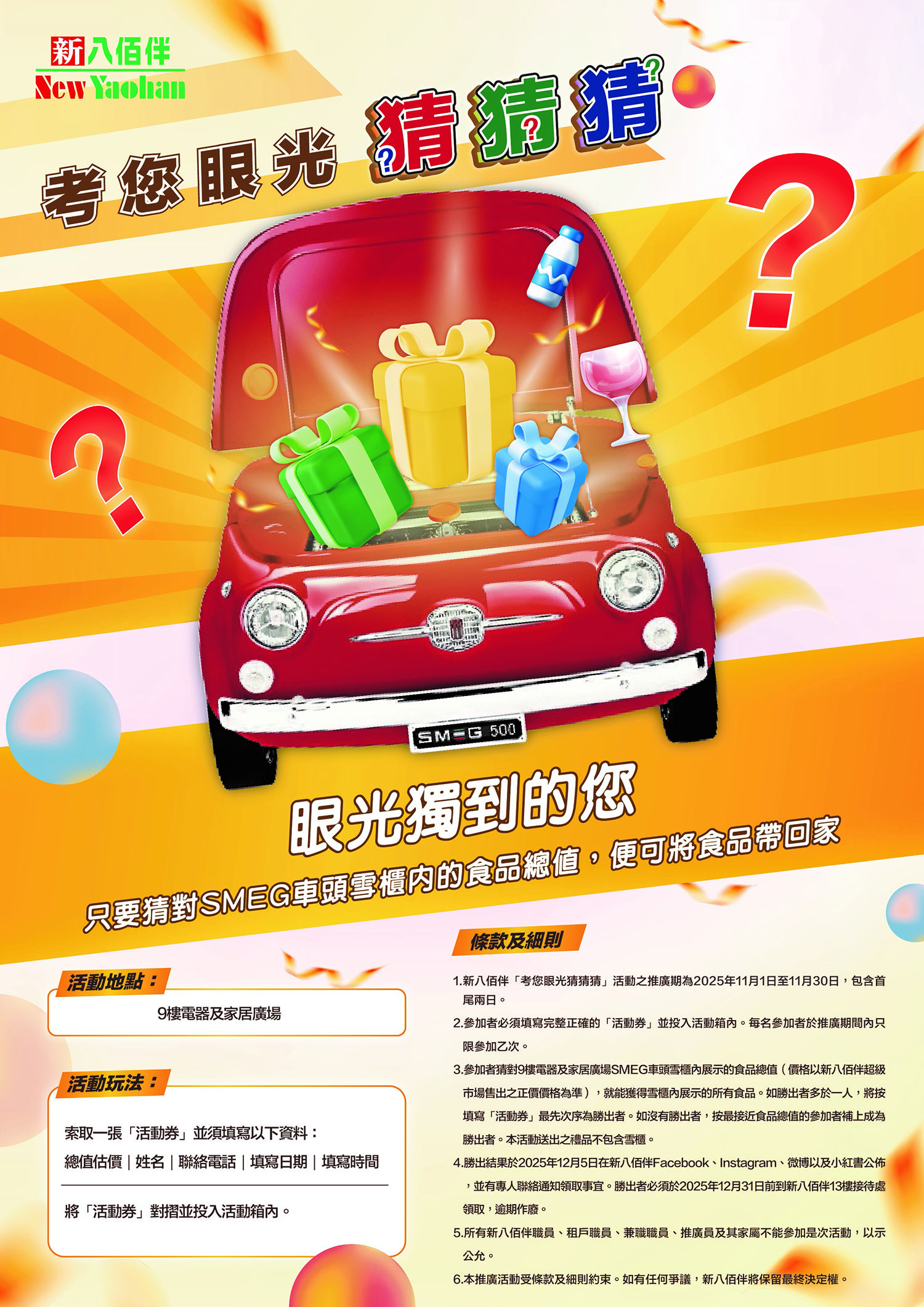 11月份「考您眼光猜猜猜」开始啦!独具慧眼的您,只要来新八佰伴9楼,猜对SMEG车头雪柜入面的食品总值,就可以将所有食品全部带回家!本次「考您眼光猜猜猜」截止日期是11月30日,详情请参阅新八佰伴官方网站。