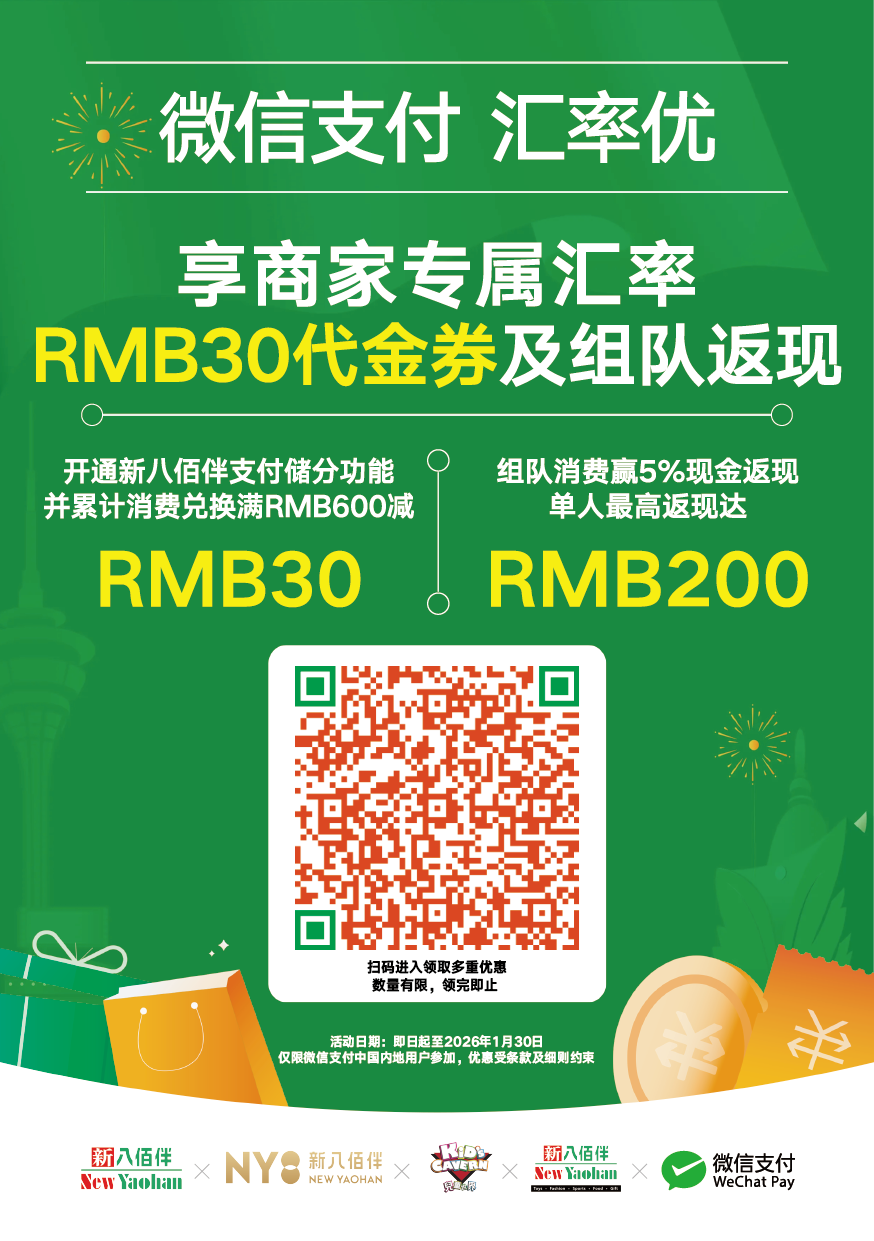 由2025年12月12日至2026年1月30日,中国内地微信支付用户在新八佰伴各活动地点消费,通过线下电子物料扫码或微信搜索『全球有礼』小程序,进入『澳门新八佰伴』页面,尊享以下购物优惠: