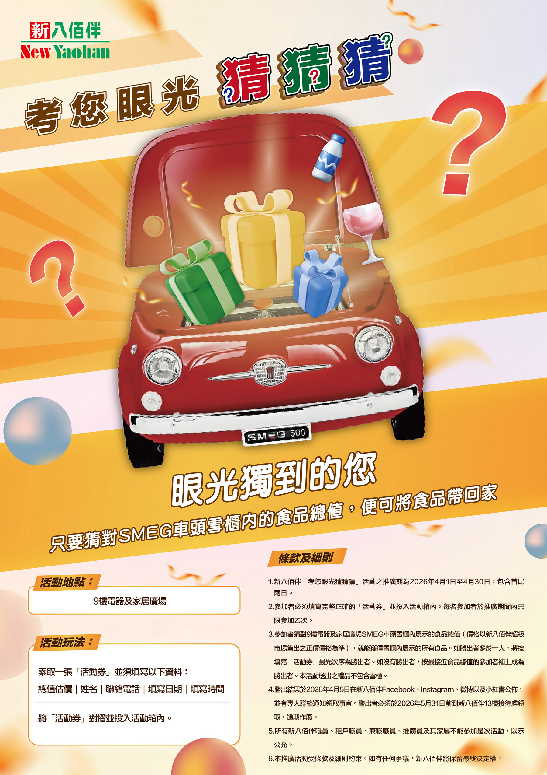 4月份「考您眼光猜猜猜」開始啦!獨具慧眼的您,只要來新八佰伴9樓,猜對SMEG車頭雪櫃入面的食品總值,就可以將所有食品全部帶回家!本次「考您眼光猜猜猜」截止日期是4月30日,詳情請參閱新八佰伴官方網站。