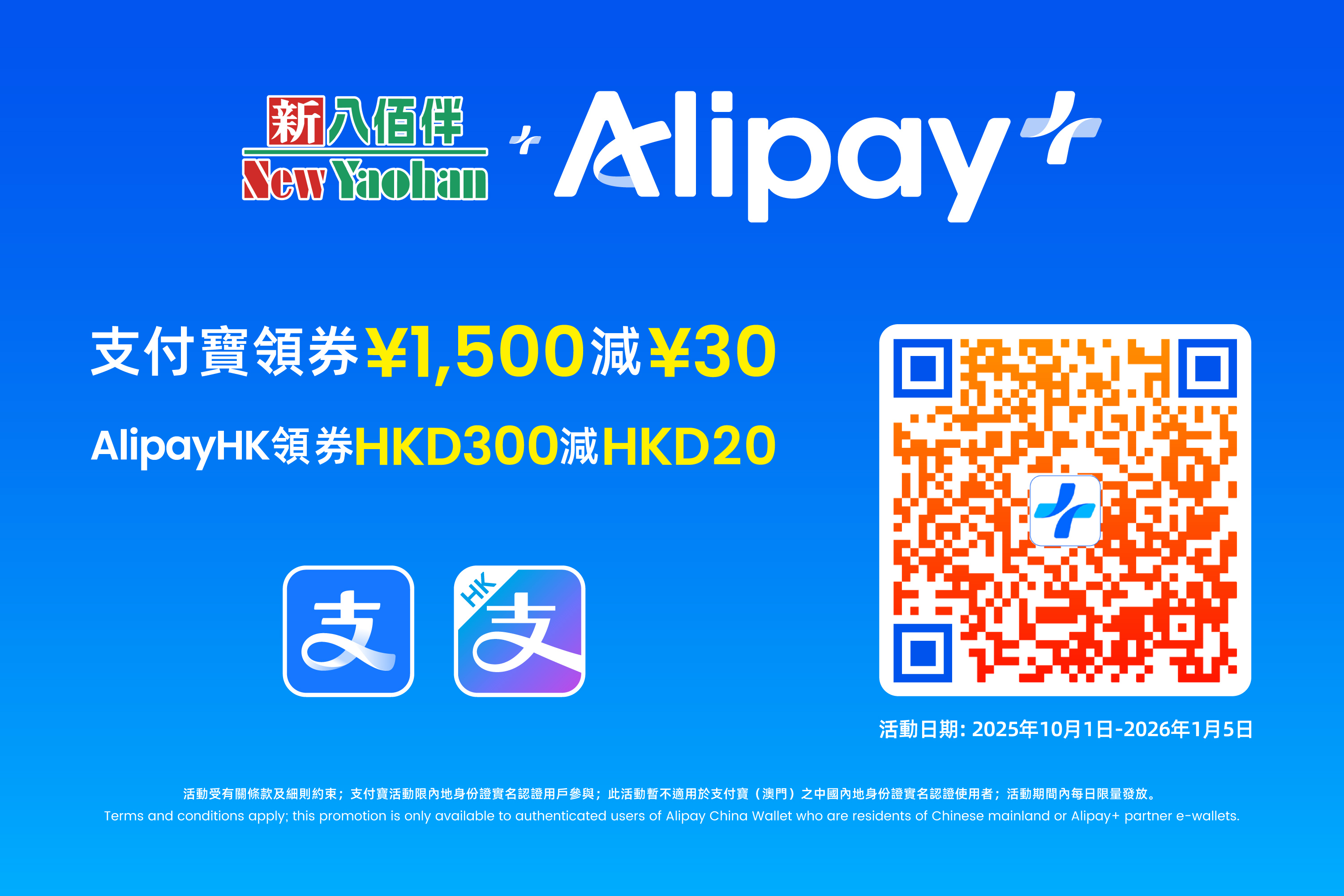 *本推廣活動受條款及細則約束。如有任何爭議,新八佰伴及支付寶保留最終決定權。更多詳情可致電「支付寶」內地客戶服務熱線:+86 571 28011180;或AlipayHK客戶服務熱線:+852 22453201查詢。