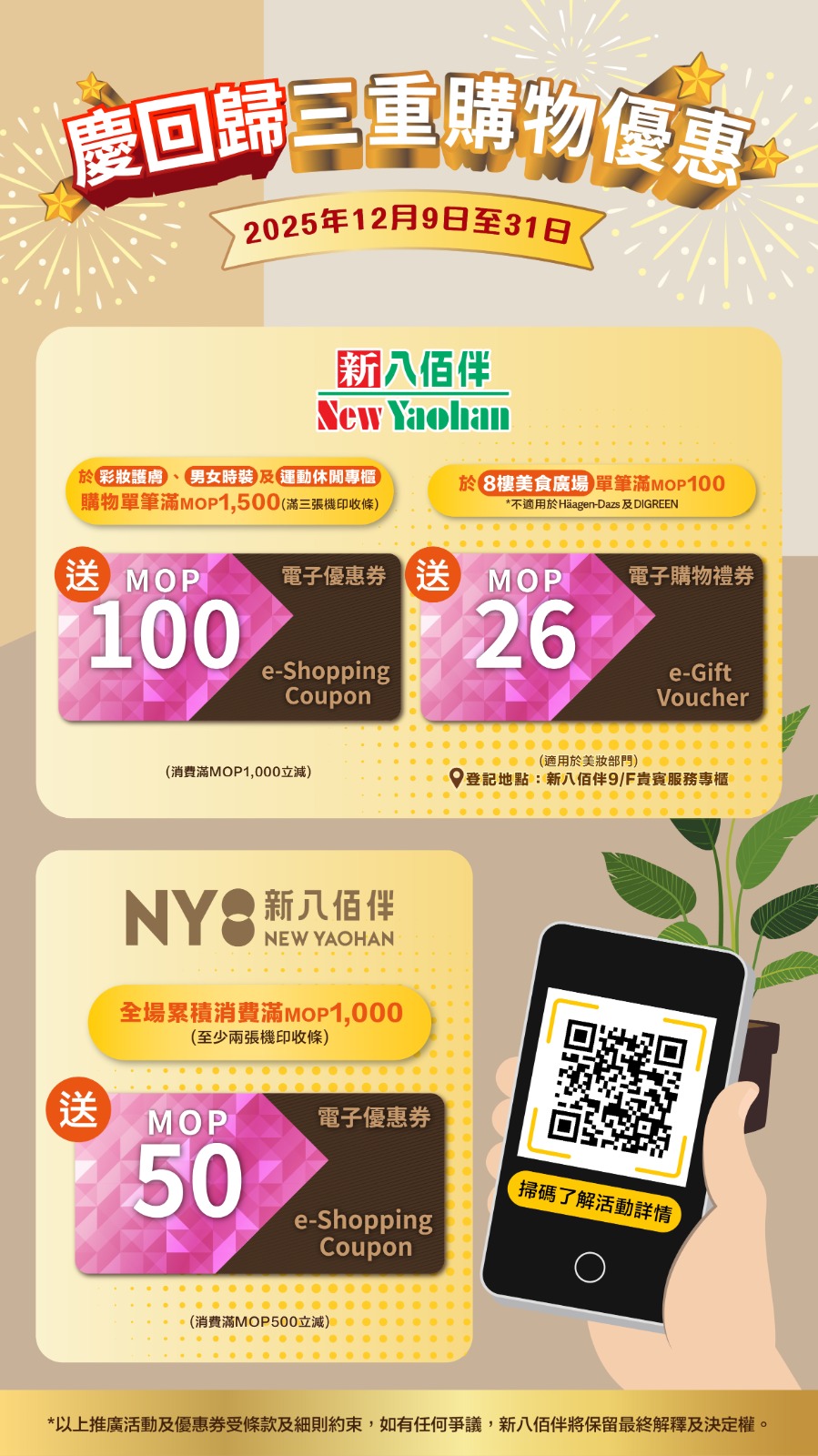 「慶回歸三重購物優惠」由2025年12月9日至31日期間舉行一系列購物活動。詳情如下: