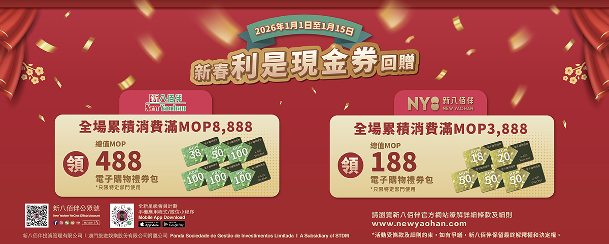 1. 2026年「新春利是現金券回贈」[下稱推廣活動] 推廣期為2026年1月1日至1月15日[下稱推廣期],新八佰伴會員於新八佰伴(南灣店)及NY8新八佰伴(上葡京店)滿足消費條件即可獲電子購物禮券包回贈。