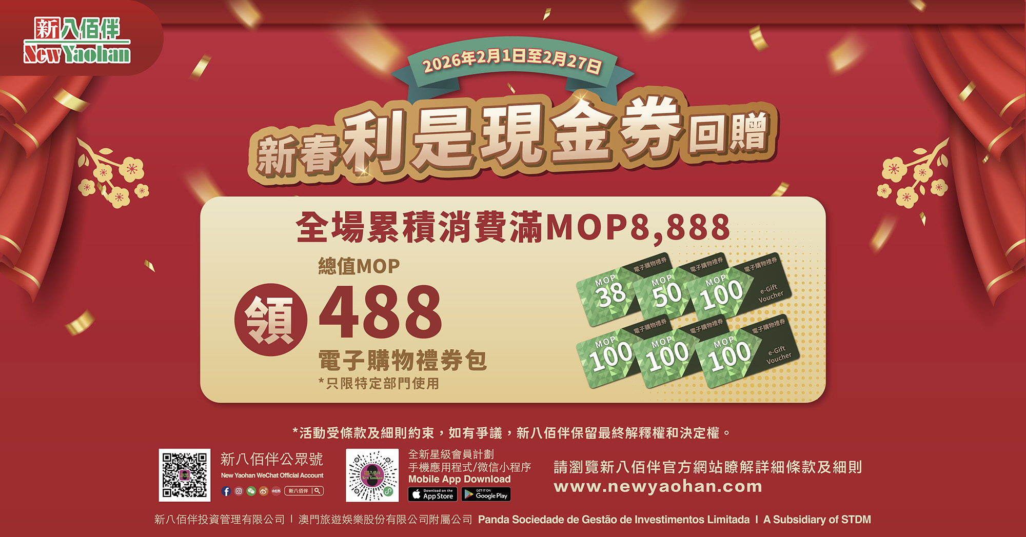 1. 2026年「新春利是現金券回贈」[下稱推廣活動] 推廣期為2026年2月1日至2月27日[下稱推廣期],新八佰伴會員於新八佰伴(南灣店)滿足消費條件即可獲電子購物禮券包回贈。